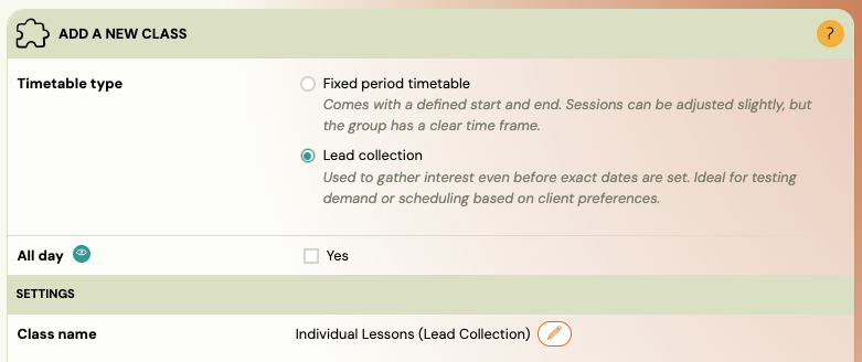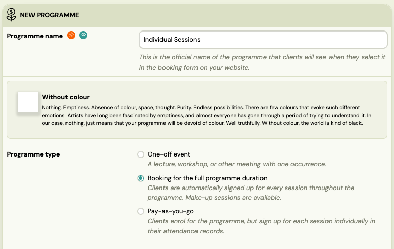 Tip: Keep the programme simple. The goal is to have a “container” to collect interest and later manage bookings.Open the programme Individual Sessions