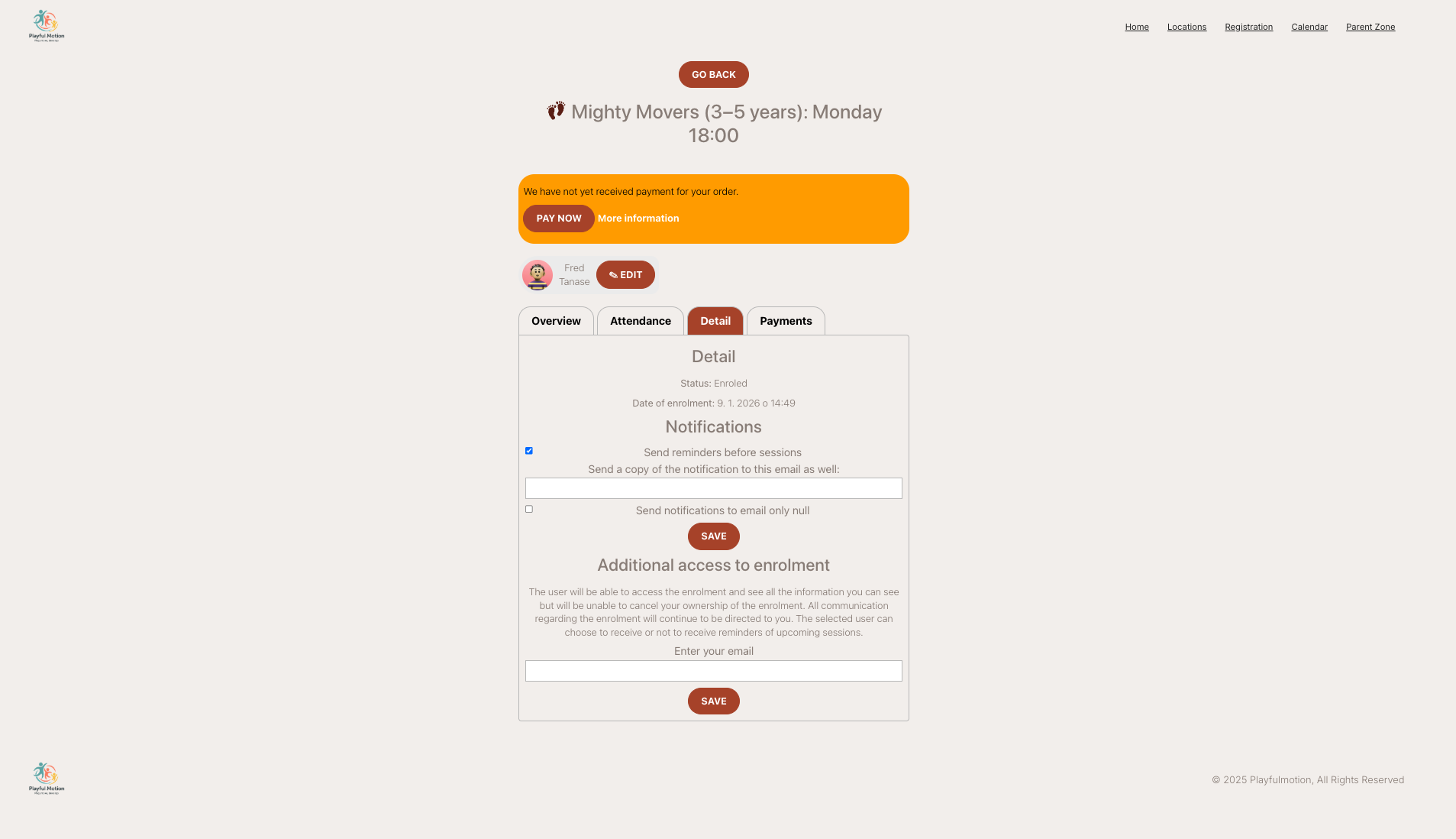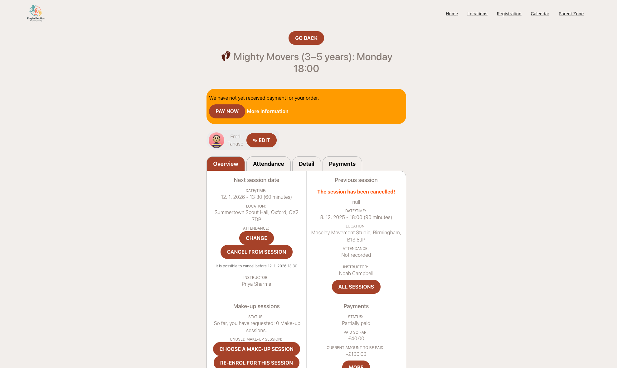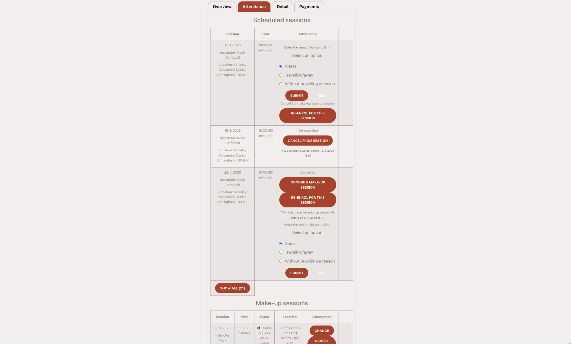 You will receive email or WhatsApp reminders, and your session list will automatically update.
