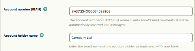 Zadajte číslo účtu IBAN, meno majiteľa bankového účtu a jeho SWIFT kód. Na tento účet budú zákazníci posielať svoje platby. Podľa toho, v ktorej banke máte založený účet, máte možnosť si automaticky párovať platby. Viac informácií, ako si toto párovanie platieb nastavíte sa dozviete